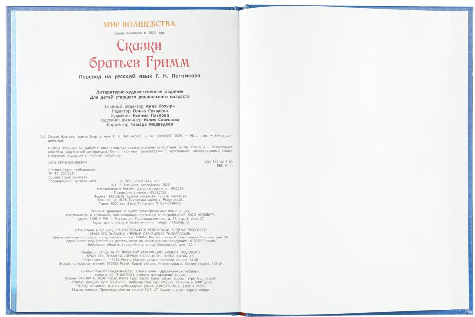 💳 Оплатить за товар можно при получении 🇰🇿 Есть бесплатная доставка по Казахстану от 1 дня 🎁 Копите бонусы с каждой покупки Серия: Мир волшебства Книга «Сказки братьев Гримм» из серии «Мир волшебства» ТМ «УМка» — отличный вариант для увлекательного чтения. В этом сборнике юного читателя ждут замечательные сказки знаменитых братьев Гримм. Все они — безусловная классика зарубежной литературы. Книга любимых произведений с красочными иллюстрациями станет отличным подарком к любому празднику. |