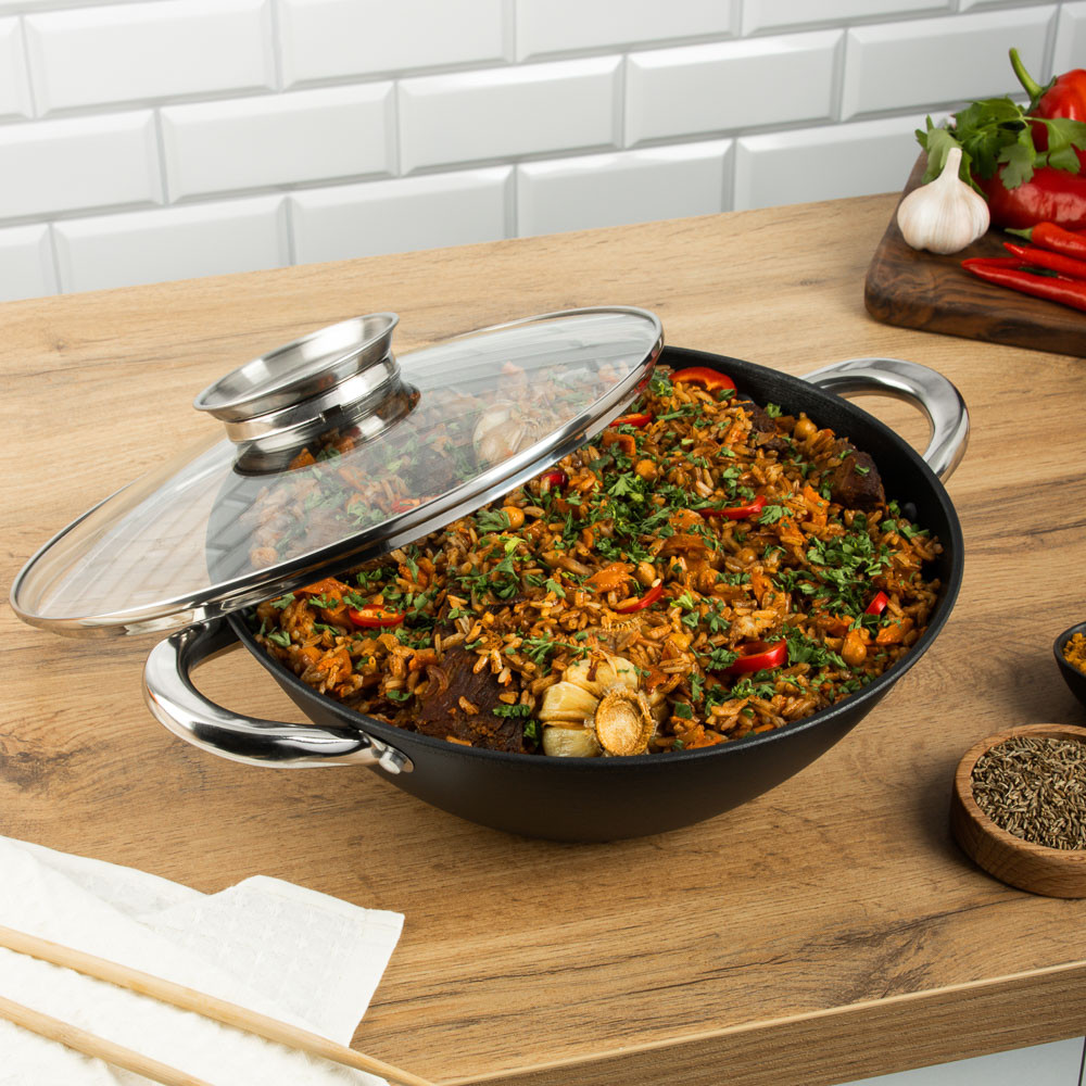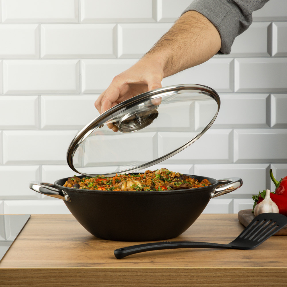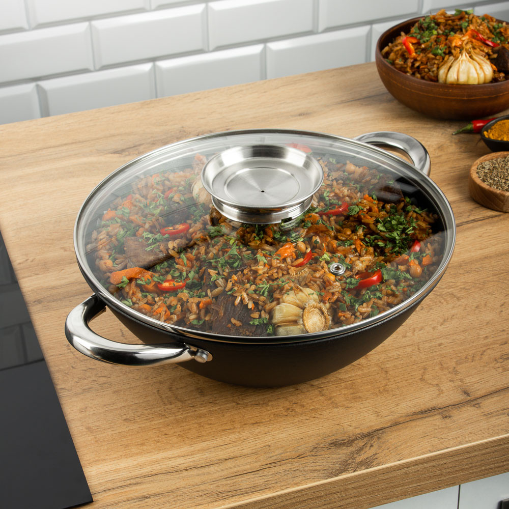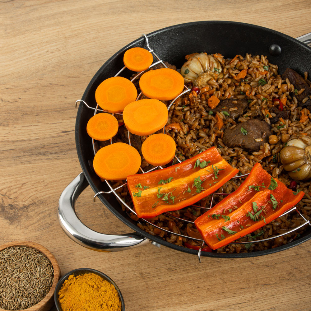 💳 Оплатить за товар можно при получении 🇰🇿 Есть бесплатная доставка по Казахстану от 1 дня 🎁 Копите бонусы с каждой покупки Плов, шурпа, лагман — шедевры восточной кухни, которые не приготовишь в обычной кастрюле. Казан — главный инструмент шеф-поваров на Востоке. Потому что только в этой посуде блюда получаются по-настоящему вкусными и ароматными. Казан сделан из чугуна. Имеет классическую круглую форму. Замечательно прогревается и сохраняет тепло, а значит не только варит и тушит, но и томит блюда, уже снятые с огня. 7 причин купить чугунный казан Satoshi диаметром 26 см со стеклянной крышкой: можно делать десерты — опускаем тесто в кипящее масло и получаем невероятно вкусные пончики; обед на пару — положите в казан овощи, а на решетку куриное филе и закройте крышкой; подходит для всех видов плит, включая индукционные; арома-отверстие в ручке крышки — подливаем воду, масло, не снимая крышки; высокопрочное антипригарное покрытие; нейлоновая лопатка для безопасного перемешивания продуктов; пара деревянных палочек для приготовления каш. |