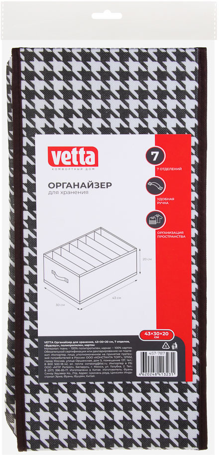 💳 Оплатить за товар можно при получении 🇰🇿 Есть бесплатная доставка по Казахстану от 1 дня 🎁 Копите бонусы с каждой покупки Органайзер для хранения Vetta «Вудхауз» — это стильный и функциональный аксессуар для вашего дома. Он состоит из 7 отделений и имеет размеры 43×30×20 см. Прочный полипропилен и плотный картон обеспечивают надёжность и долговечность изделия. Черно-белый дизайн с рисунком «гусиная лапка» придает органайзеру элегантный и современный вид. Этот аксессуар станет отличным решением для организации пространства и поддержания порядка в вашем доме. |