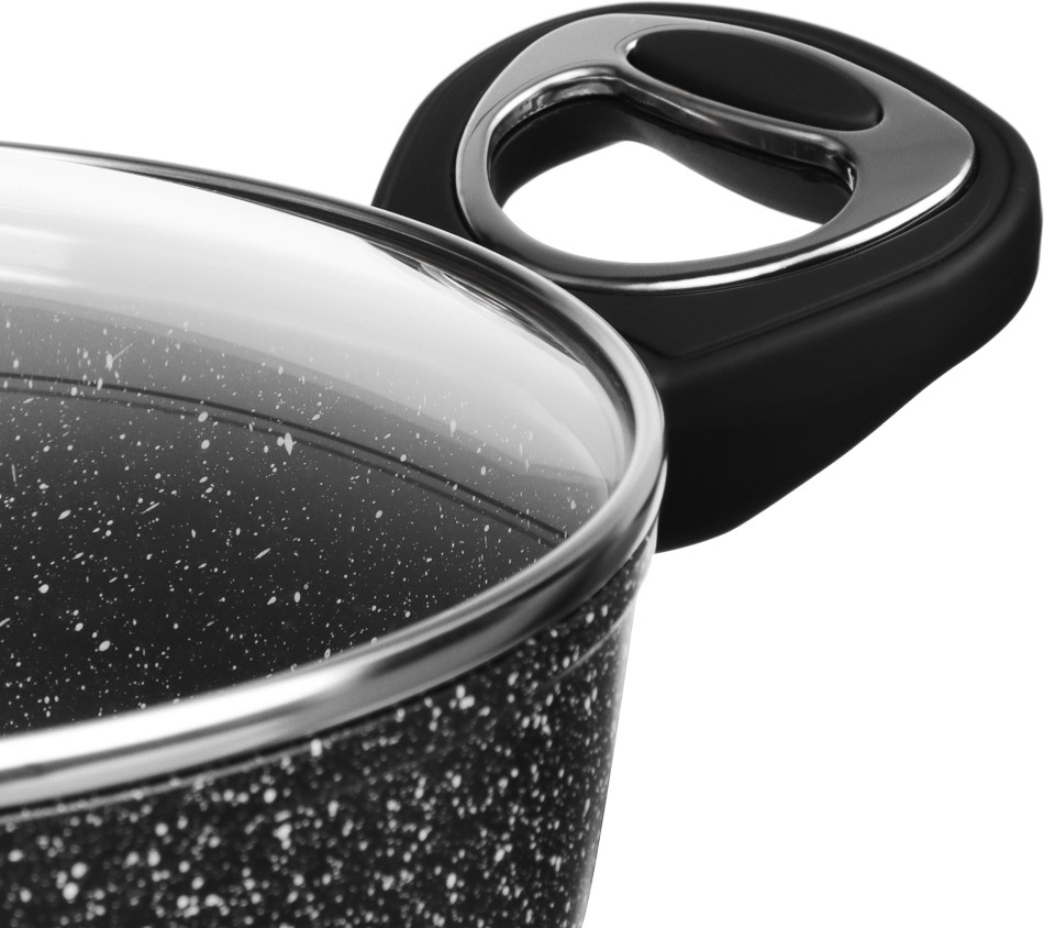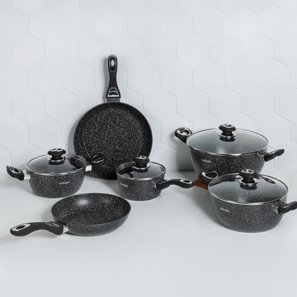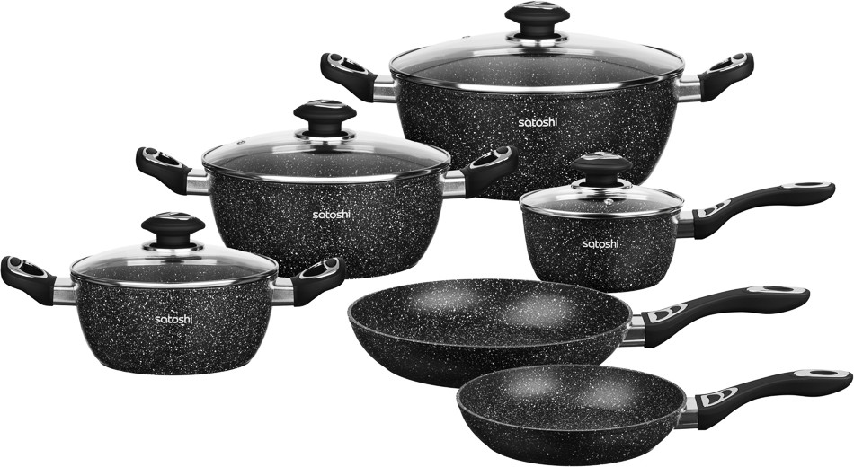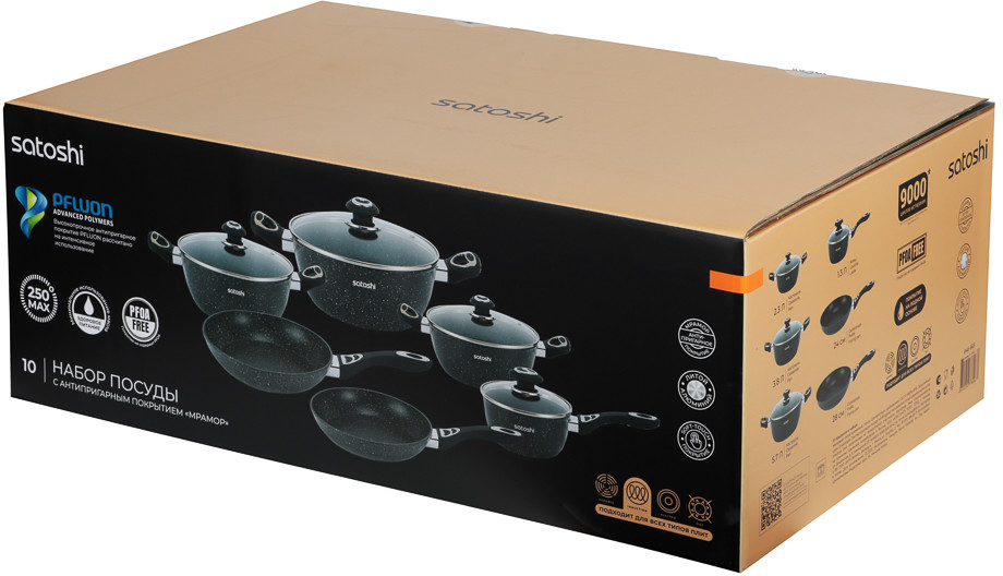 💳 Оплатить за товар можно при получении 🇰🇿 Есть бесплатная доставка по Казахстану от 1 дня 🎁 Копите бонусы с каждой покупки Набор посуды из литого алюминия из 10 предметов Satoshi «Танто» включает все необходимое для приготовления любых блюд на домашней кухне. В состав набора входят 3 кастрюли объемом 2.3 л, 3.8 л, 5.7 л с прозрачными стеклянными крышками, ковш с крышкой объемом 1.3 л и 2 сковороды диаметром 24 и 28 см. Вся посуда имеет высокопрочное безопасное антипригарное покрытие без содержания PFOA, рассчитанное на интенсивное использование. Стильный дизайн в черном цвете с фактурой «под камень» украсит любую кухню и впишется в любой интерьерный стиль. Посуда подходит для приготовления диетических блюд без масла, продукты не прилипают и не пригорают. Ручки не нагреваются, прочные, эргономичные и долговечные. Набор предназначен для всех типов плит, включая и индукцию. Для сохранения целостности покрытия необходимо пользоваться деревянными, силиконовыми или пластиковыми лопаточками во время приготовления. |
