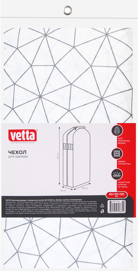 Vetta Чехол для одежды «Валери»В данный момент этот товар отсутствует в продаже. Возможно, у нас найдется аналогичный или похожий товар здесь. Чехол-кофр для одежды семейный Vetta «Валери» 60×30×120 см предназначен для хранения верхней одежды — курток, пальто, плащей, а также деловых костюмов и платьев. Прекрасно защищает одежду от пыли и сминания. Замок-молния по всей длине чехла обеспечивает беспрепятственный доступ к гардеробу без необходимости снятия чехла с вешалки. Прозрачное окошко позволяет быстро найти нужную вещь. |