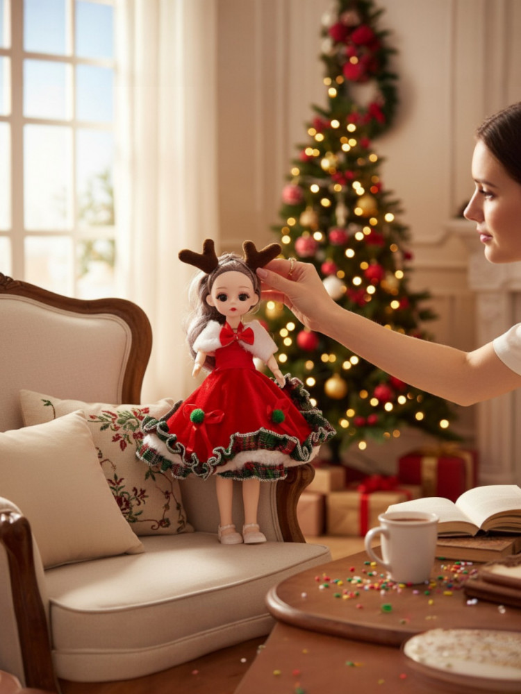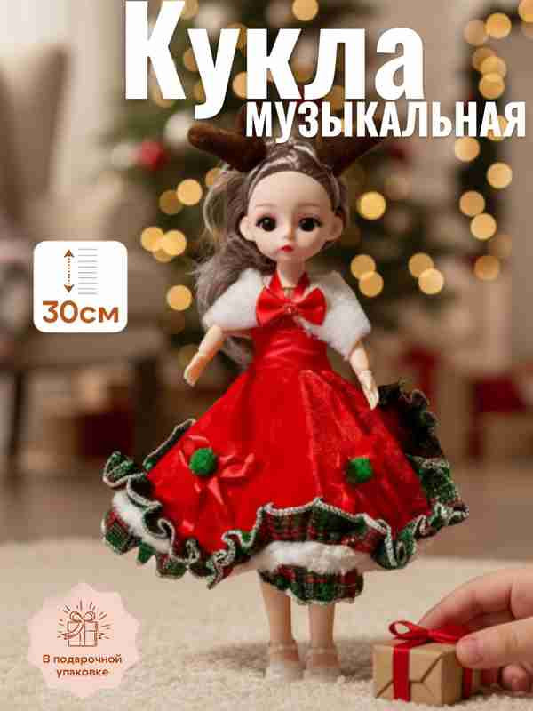 Подарите ребёнку настоящую зимнюю сказку! Очаровательная шарнирная кукла ростом 30 см в роскошном праздничном наряде: яркие платья в красных и зелёных тонах с меховой оторочкой, снежинками, помпонами и бантами. На голове — милые оленьи рожки и цепочка с кольцом: куклу можно повесить как большой стильный брелок.