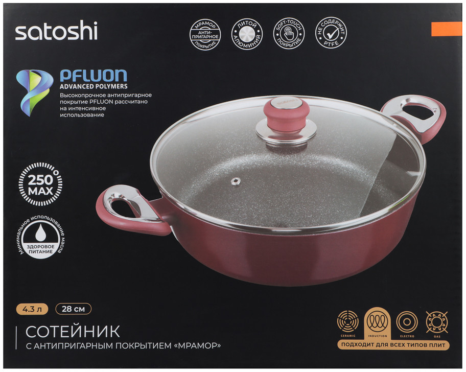 💳 Оплатить за товар можно при получении 🇰🇿 Есть бесплатная доставка по Казахстану от 1 дня 🎁 Копите бонусы с каждой покупки Сотейник Satoshi Ла Мери объемом 4.3 л — это стильное и функциональное решение для готовки на любой кухне. Изготовленный из литого алюминия, он оснащен антипригарным мраморным покрытием, которое обеспечивает легкость приготовления и минимальное использование масла. Сотейник диаметром 28 см и высотой 8 см идеально подходит для тушения, жарки и приготовления объемных блюд. Стеклянная крышка с пароотводом позволяет контролировать процесс готовки, сохраняя аромат и сочность блюд. Оригинальный бордовый цвет добавляет изысканности, а совместимость с индукционными плитами делает сотейник универсальным. |