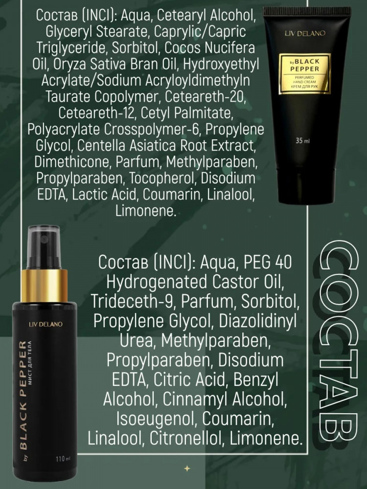 💳 Оплатить за товар можно при получении 🇰🇿 Есть бесплатная доставка по Казахстану от 1 дня 🎁 Копите бонусы с каждой покупки Серия: Perfumed collection Подарочный набор для женщин серии Perfumed collection от белорусского бренда уходовой косметики Liv Delano. Подари себе непревзойденный уход и ароматерапию. Аромат продуктов парфюмированной коллекции № 2 наполнен нотами пряного черного перца, легким цитрусовым благоуханием, тонкой вуалью амбры и белых цветов, пряно-восточными нотами марокканских песков, яркими специями и сладостями. |