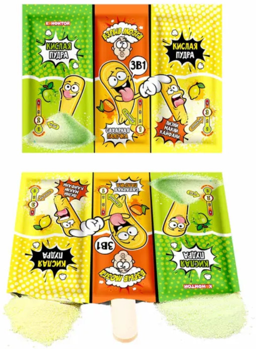 • вкусовое трио: центральная сахарная палочка имеет сладкий вкус (например, апельсин), одно отделение — кислую пудру со вкусом яблока, а второе — экстра-кислую пудру со вкусом лимона;