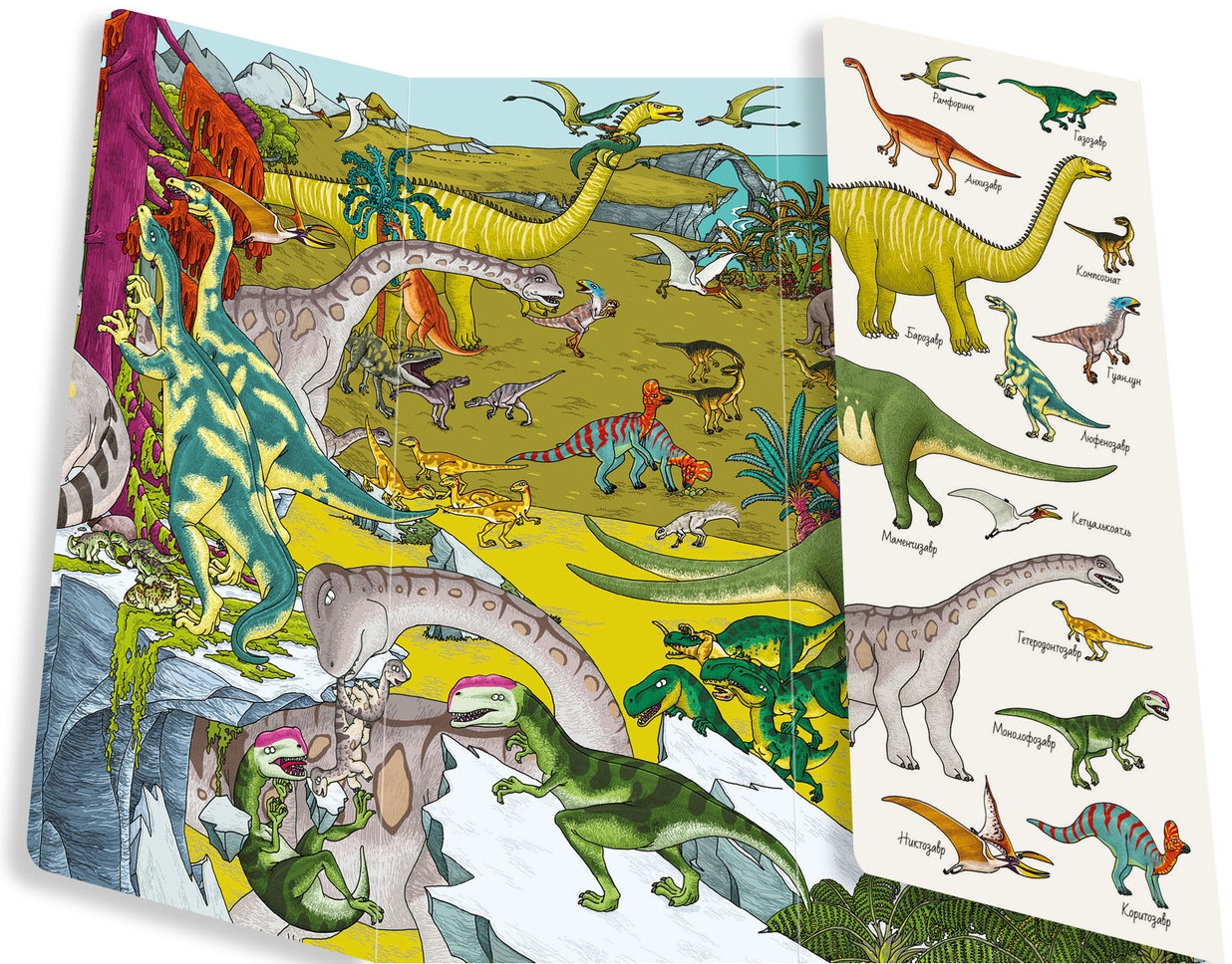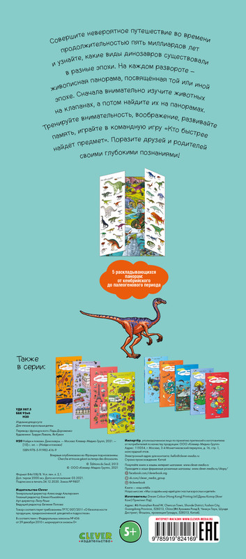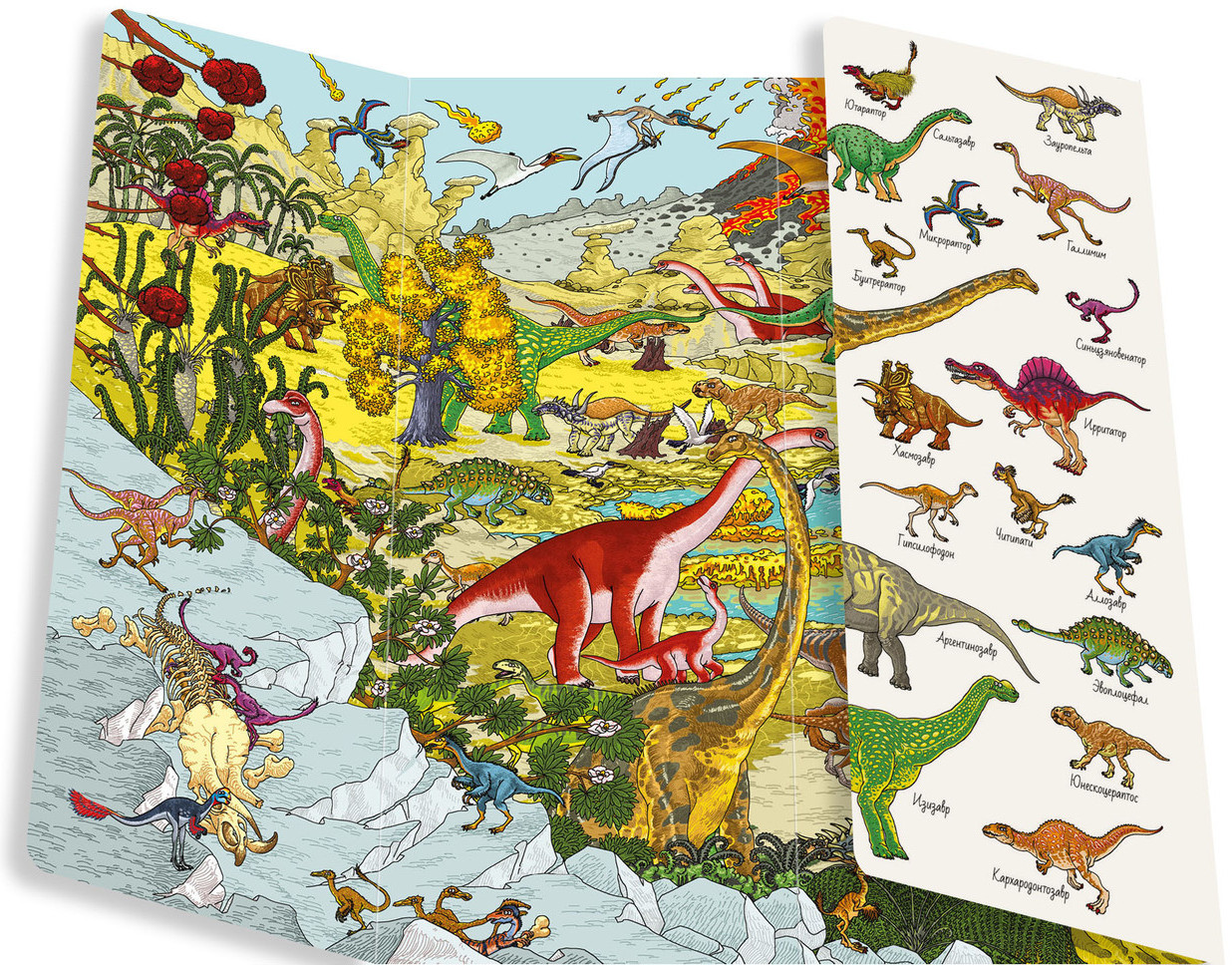 💳 Оплатить за товар можно при получении 🇰🇿 Есть бесплатная доставка по Казахстану от 1 дня 🎁 Копите бонусы с каждой покупки Серия: Найди и покажи Совершите невероятное путешествие во времени продолжительностью пять миллиардов лет и узнайте, какие виды динозавров существовали в разные эпохи. На каждом развороте — живописная панорама, посвященная той или иной эпохе. Сначала внимательно изучите животных на клапанах, а потом найдите их на панорамах. Тренируйте внимательность, воображение, развивайте память, играйте в командные игры «Кто быстрее найдет предмет». И поразите друзей и родителей своими глубокими познаниями! |