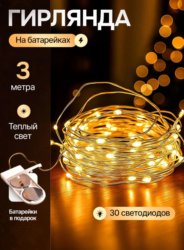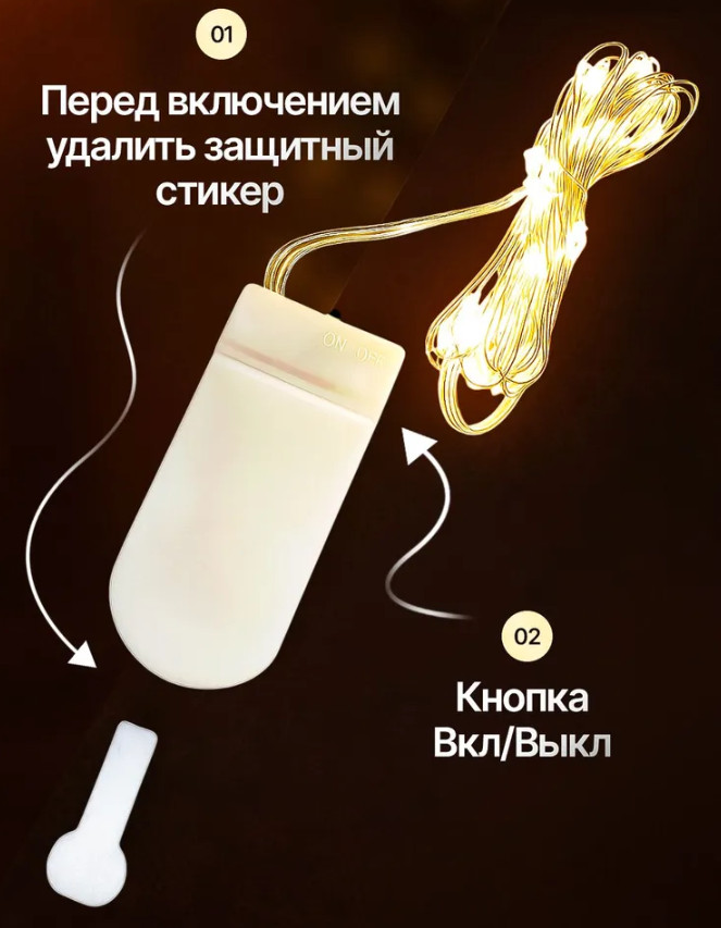Гирлянда работает от батареек, поэтому вы полностью свободны от розеток и проводов. Её можно разместить в вазе, на полке, в букете, на праздничном столе или использовать для декора мероприятий. Две батарейки уже входят в комплект — гирлянда готова к работе сразу после распаковки.