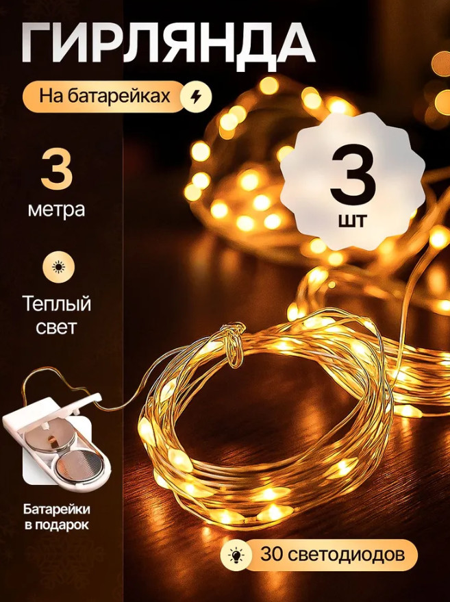 Гирлянда работает от батареек, поэтому вы полностью свободны от розеток и проводов. Её можно разместить в вазе, на полке, в букете, на праздничном столе или использовать для декора мероприятий. Две батарейки уже входят в комплект — гирлянда готова к работе сразу после распаковки.