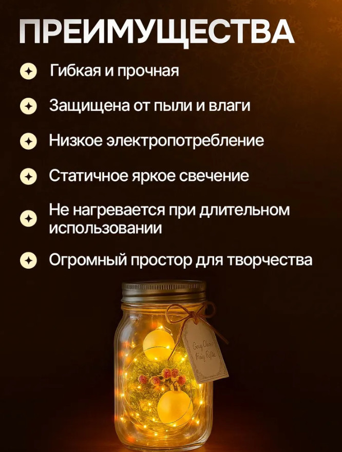 Идеально подходит для новогоднего декора, праздников, романтических вечеров, hand-made проектов, оформления свадеб и уютных домашних композиций. Эта гирлянда не требует повода — она создана, чтобы дарить тепло и свет каждый день.