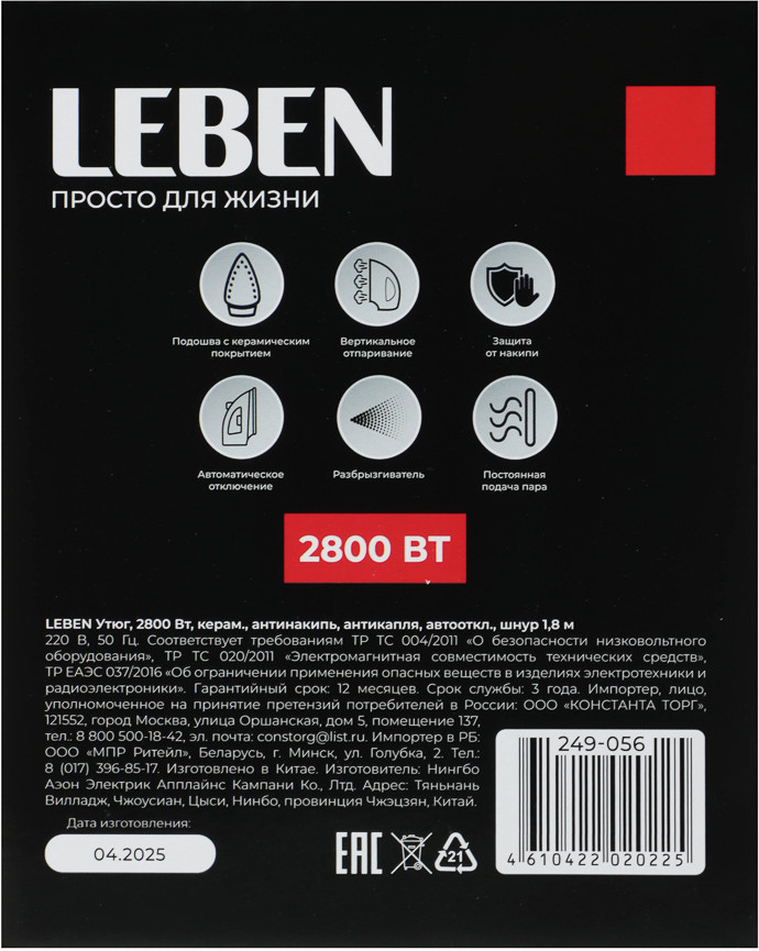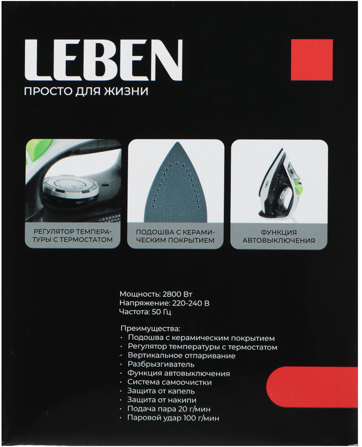 💳 Оплатить за товар можно при получении 🇰🇿 Есть бесплатная доставка по Казахстану от 1 дня 🎁 Копите бонусы с каждой покупки Утюг Leben — идеальный помощник в быту. Благодаря мощности 2800 Вт и керамической подошве утюг обеспечивает быстрое и равномерное распределение тепла. Функции антинакипи и антикапли предотвращают образование известкового налёта и защищают одежду от пятен. Подача пара 20 г/мин и паровой удар 100 г/мин позволяют эффективно разглаживать складки на разных типах тканей. Автоматическое отключение гарантирует безопасность использования, а система самоочистки упрощает уход за утюгом. Регулировка температуры и паровой удар обеспечивают удобство в работе с разными материалами. Длина шнура — 1.8 метра, что обеспечивает комфортную работу. |