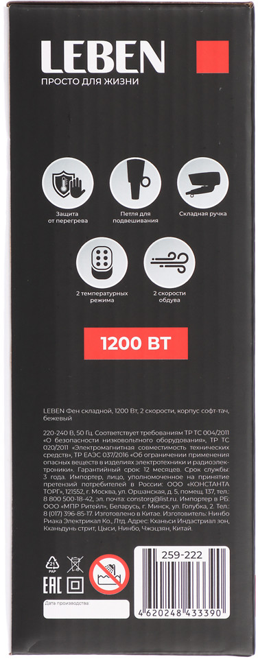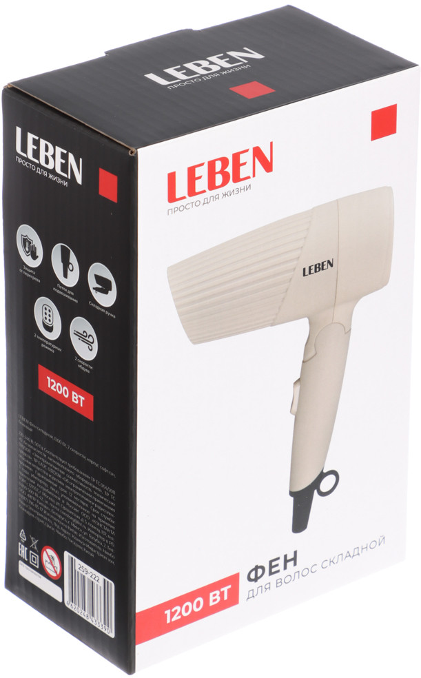 💳 Оплатить за товар можно при получении 🇰🇿 Есть бесплатная доставка по Казахстану от 1 дня 🎁 Копите бонусы с каждой покупки Фен Leben обладает мощностью 1200 Вт и двумя скоростями, что позволяет быстро высушить волосы и сделать укладку. Корпус фена выполнен из мягкого материала софт-тач, который приятен на ощупь и предотвращает скольжение в руке. Оснащён защитой от перегрева, которая автоматически отключает его при достижении критической температуры, обеспечивая безопасность использования. Также имеется петля для подвешивания, позволяющая хранить фен в удобном месте. Два температурных режима позволяют выбрать оптимальный нагрев для разных типов волос, а складная конструкция делает фен компактным и удобным для путешествий. |