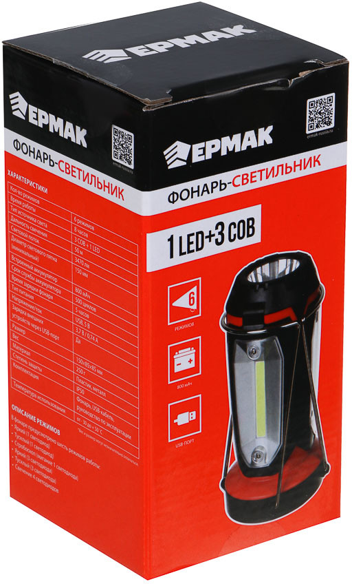 💳 Оплатить за товар можно при получении 🇰🇿 Есть бесплатная доставка по Казахстану от 1 дня 🎁 Копите бонусы с каждой покупки Многофункциональный фонарь-светильник Ермак — надёжный источник света для дома, дачи, автомобиля или активного отдыха. Оснащён одним LED и тремя COB-светодиодами, обеспечивающими яркость до 200 лм и дальность освещения до 100 м. Работает в 6 режимах.. Встроенный аккумулятор 800 мАч обеспечивает до 10 часов автономной работы, зарядка через USB-кабель занимает около 5 часов. Прочный пластиковый корпус с защитой IP50 устойчив к перепадам температур от —20 до +50 °C. Компактные размеры (15×8.5×8.5 см) делают фонарь удобным в транспортировке и хранении. |