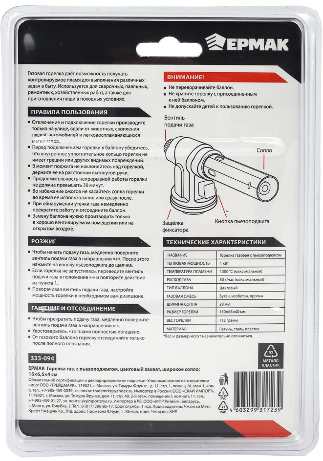 Ермак Горелка газовая с пьезорозжигом-30% +104