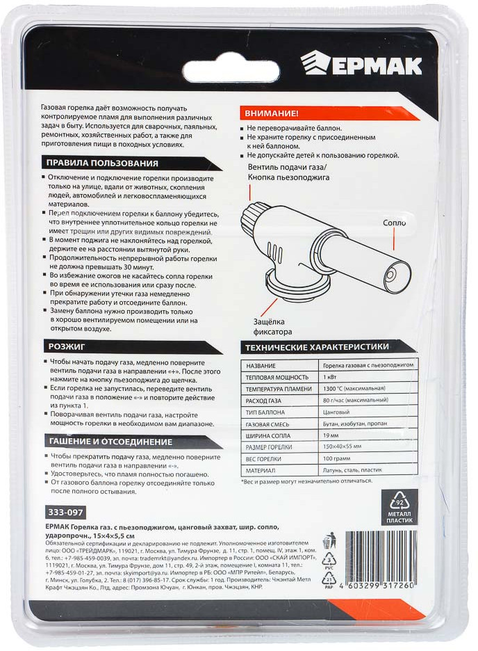 Ермак Горелка газовая с пьезорозжигом-30% +89