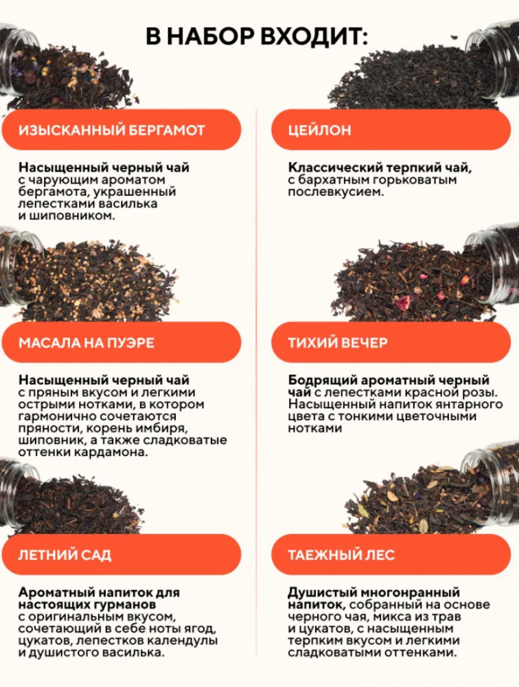 В коллекции — только натуральный чай листовой, который наполняет каждый глоток насыщенным ароматом и вкусом, превращая этот чай подарочный набор в тёплое и универсальное решение. Новогодний набор с ароматными сортами включает чай черный крупнолистовой — насыщенный, с глубоким вкусом. Такой чай черный станет отличным выбором как подарок бабушке, жене: искренний, уютный, с вниманием.