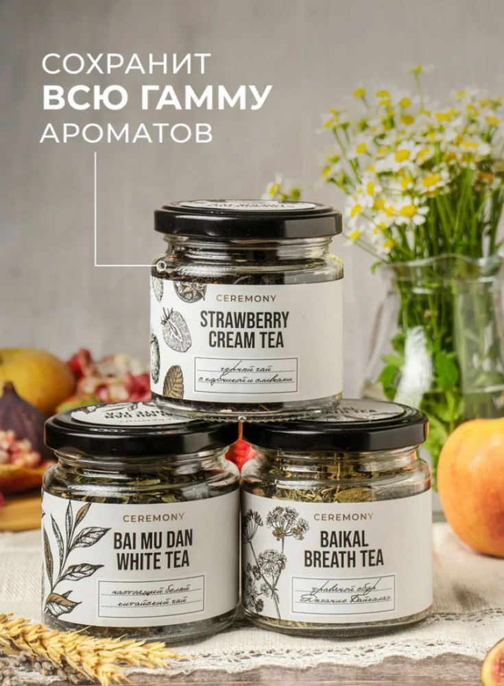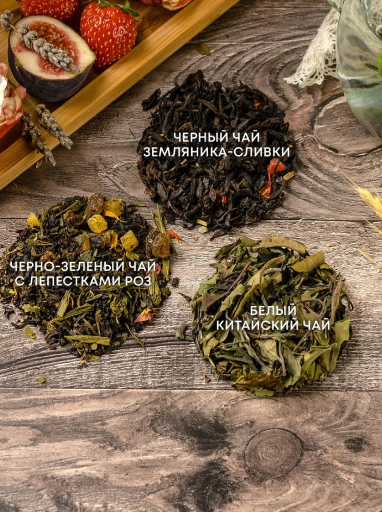 Земляника со сливками: черный индийский чай, листья клубники, цукаты, лепестки сафлора, ароматизатор; 30 г.