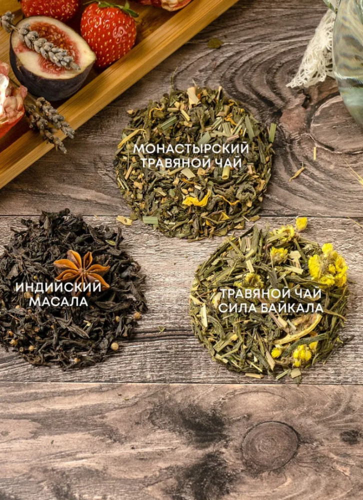 Монастырский: лимонная трава (лемонграсс), мелисса, лист крапивы, облепиха, шалфей, лист клубники, мята, календула, чабрец, липовый цвет (липа), лист ежевики; 26 г.