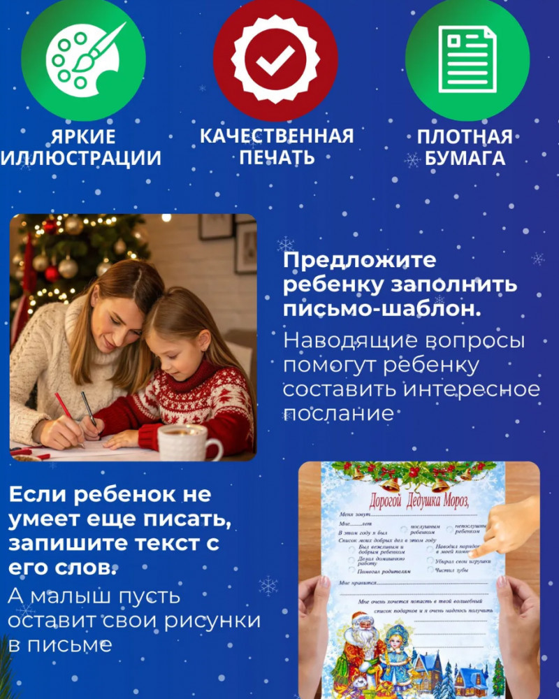 Письмо Деду Морозу с конвертом — настоящее новогоднее чудо для ребёнка! Подарите эмоции, которые запомнятся на весь год. Красочный набор «Письмо Деду Морозу» превращает ожидание Нового года в волшебный ритуал — ребёнок с радостью напишет своё желание и поверит в сказку.