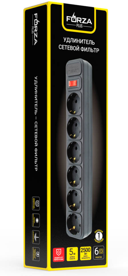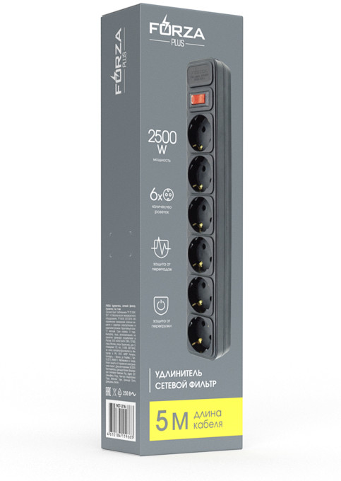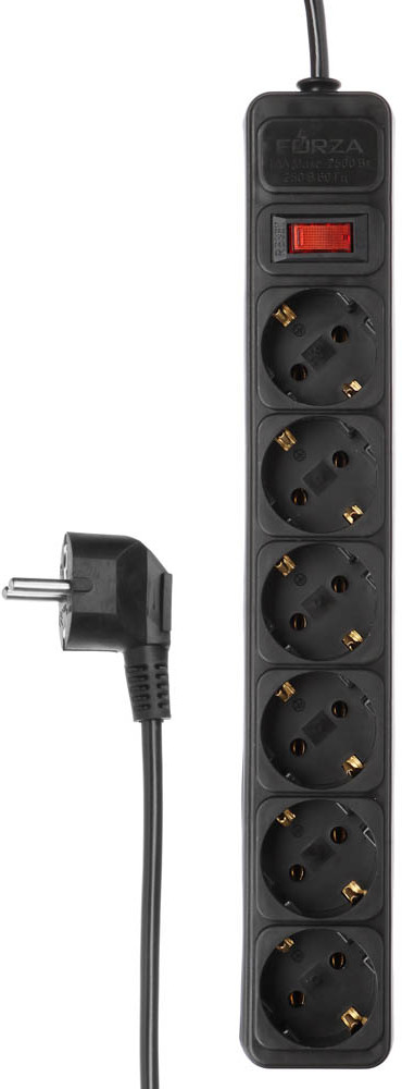 Удлинитель Forza с сетевым фильтром представляет собой устройство, предназначенное для подключения и распределения электроэнергии. Он оснащен шестью розетками с заземлением, что позволяет подключить до шести устройств одновременно. Общая длина удлинителя составляет 3 метра. Устройство оснащено функцией сетевого фильтра, которая обеспечивает защиту подключенных устройств от высокочастотных и импульсных помех, а также от короткого замыкания. Каждая розетка имеет автоматический предохранитель на 10 А. Удлинитель выполнен из качественных материалов и имеет черный цвет. Провод длиной 3 метра, его сечение составляет 1 мм². Это обеспечивает достаточную мощность для подключения большинства бытовых приборов. На корпусе удлинителя имеется общий выключатель для всех розеток, который позволяет быстро отключать все устройства одновременно.