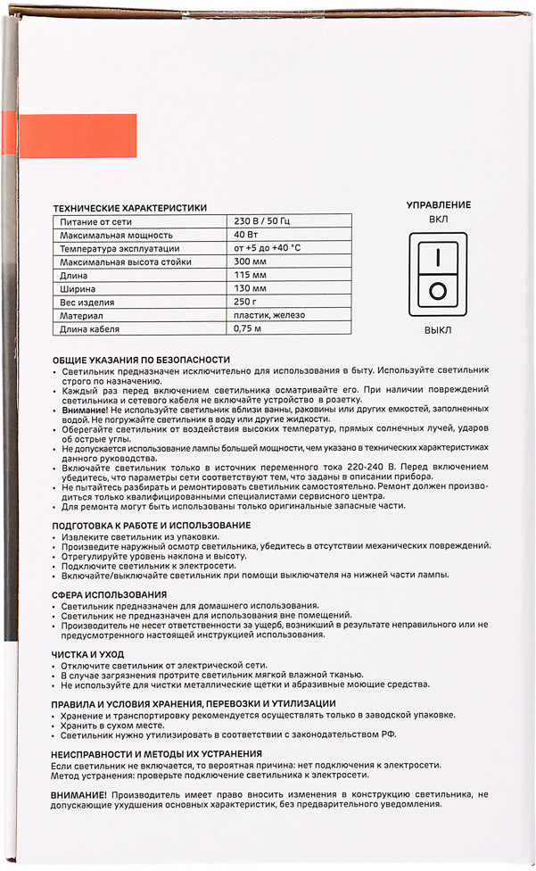 💳 Оплатить за товар можно при получении 🇰🇿 Есть бесплатная доставка по Казахстану от 1 дня 🎁 Копите бонусы с каждой покупки Светильник оснащен цоколем E27, что позволяет использовать различные типы ламп, обеспечивая гибкость в настройке освещения. Мощность 40 Вт гарантирует яркое и равномерное освещение, которое подойдет как для чтения и работы, так и для создания уютной атмосферы в вашем пространстве. Особенность модели — гнущаяся ножка длиной 10 см, которая позволяет регулировать направление света и адаптировать его под любые задачи. Это делает светильник особенно удобным для использования в небольших пространствах, на кухне, в гардеробной или рабочем уголке. Шнур длиной 75 см обеспечивает свободу в размещении, позволяя установить светильник на нужном расстоянии от источника питания. |