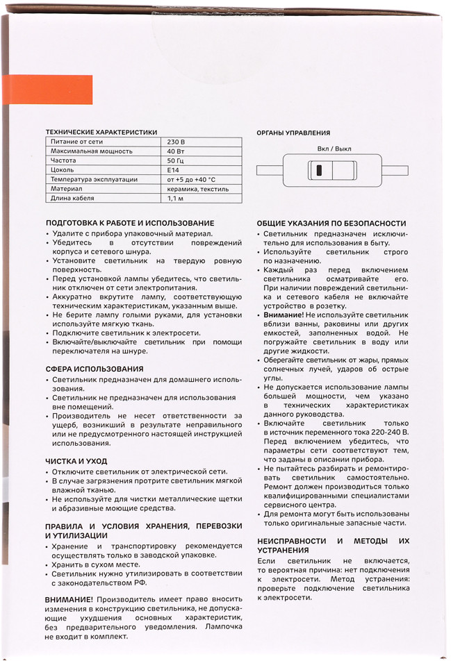 💳 Оплатить за товар можно при получении 🇰🇿 Есть бесплатная доставка по Казахстану от 1 дня 🎁 Копите бонусы с каждой покупки Изысканный настольный светильник Люцерн от BY представляет собой гармоничное сочетание элегантного дизайна и практичности. Благодаря компактной высоте в 27 сантиметров, этот светильник идеально впишется в любой интерьер, будь то рабочий стол, прикроватная тумбочка или журнальный столик. Белоснежный керамический корпус в сочетании с мягкими текстильными элементами создает атмосферу уюта и комфорта. Продуманная конструкция обеспечивает равномерное освещение рабочей зоны, а классический дизайн делает светильник универсальным дополнением к любому интерьеру. Модель оснащена стандартным цоколем E14, который подходит для большинства ламп мощностью до 40 Вт, что позволяет настроить интенсивность освещения по своему вкусу. Работа от сети 230В гарантирует стабильную и безопасную эксплуатацию. |
