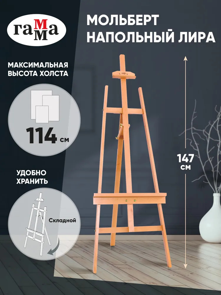 Напольный мольберт с бегунком Лира Гамма «Студия» — идеальная модель для пленэра, путешествий, также может быть использован как настольный мольберт. Размер мольберта — 54×73×147 см, максимальный размер холста для работы — 114 см.