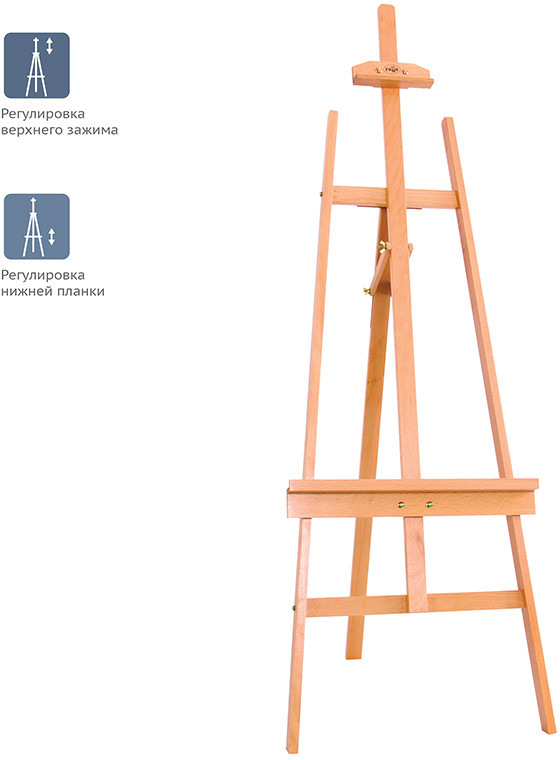 Мольберт типа Лира имеет регулировку верхнего зажима и нижней планки. Мольберт изготовлен из лакированного бука. Оснащён неподвижной мачтой и полкой для установки холста. Телескопические ножки легко раскладываются и надёжно фиксируются. Пластиковые опоры обеспечивают устойчивость даже на неровной поверхности. В комплекте чехол для бережного хранения и удобной транспортировки Поставляется в разобранном виде.