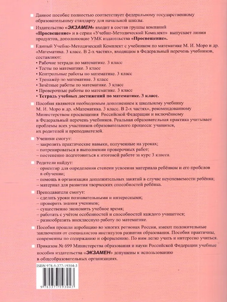 💳 Оплатить за товар можно при получении 🇰🇿 Есть бесплатная доставка по Казахстану от 1 дня 🎁 Копите бонусы с каждой покупки Серия: Учебно-методический комплект. Начальная школа Математика. 3 класс. Тетрадь учебных достижений к учебнику М. И. Моро. Настоящее пособие полностью соответствует федеральному государственному образовательному стандарту для начальной школы. Пособие составлено в соответствии с программой учебника по математике (авторы М. И. Моро и др. «Математика. 3 класс. В 2-х частях»). Эта работа носит прогностический характер и направлена на выявление возможных пробелов в знаниях третьеклассника. Тетрадь формирует навыки самоконтроля, навыки объективной оценки своих успехов. Пособие представляет собой комплексную систему контроля учебных достижений, предусматривающую последовательное выполнение заданий, самостоятельную проверку результатов и итоговую самооценку. Современное методическое наполнение и соответствие федеральным государственным образовательным стандартам обеспечивают эффективность применения в учебном процессе. |