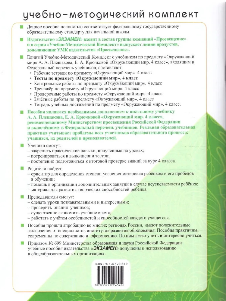💳 Оплатить за товар можно при получении 🇰🇿 Есть бесплатная доставка по Казахстану от 1 дня 🎁 Копите бонусы с каждой покупки Серия: Учебно-методический комплект. Начальная школа Настоящее пособие полностью соответствует федеральному государственному образовательному стандарту для начальной школы. Пособие содержит тестовые задания по всем темам учебного комплекса «Окружающий мир» для 4 класса (авторы А. А. Плешаков, Е. А. Крючкова). Каждый тест состоит из шести вопросов с выбором одного варианта ответа, при этом задания, отмеченные звёздочкой, могут содержать несколько неверных ответов. В разделе самоконтроля представлены правильные ответы на все вопросы. Издание предназначено для использования педагогами и родителями с целью диагностики уровня освоения учебного материала. |