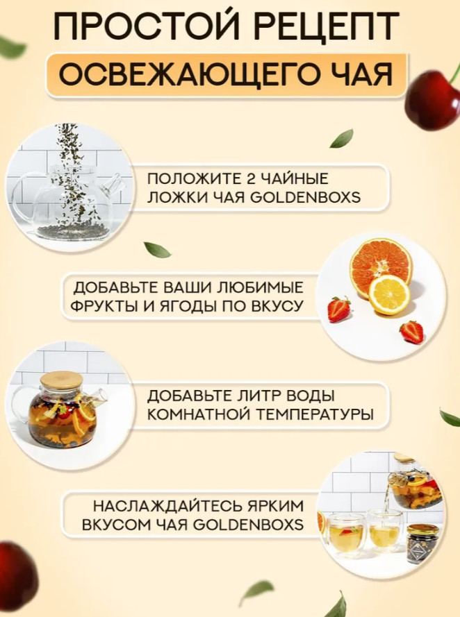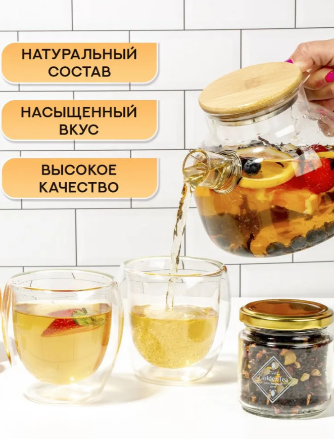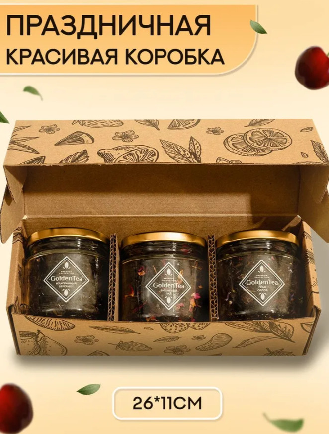 Каждая баночка содержит ассорти из крупнолистовых, свежих и ароматных чаёв с кусочками фруктов и ягод. Натуральные добавки придают напитку насыщенный вкус и яркий аромат. Заварка изготовлена исключительно из качественного сырья без искусственных компонентов. Стеклянные ёмкости подходят для многократного использования и помогают долго сохранять свежесть чая. Премиальная чайная коллекция от бренда GoldenTea оформлена в красивой подарочной упаковке и станет универсальным решением для любого случая.