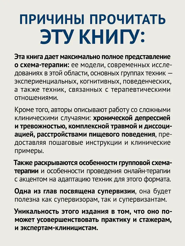 💳 Оплатить за товар можно при получении 🇰🇿 Есть бесплатная доставка по Казахстану от 1 дня 🎁 Копите бонусы с каждой покупки Серия: Когнитивно-поведенческая психотерапия Эта книга дает максимально полное представление о схема-терапии: ее модели, современных исследованиях в этой области, основных группах техник: экспериенциальных, когнитивных, поведенческих, а также техник, связанных с терапевтическими отношениями. Кроме того, авторы описывают работу со сложными клиническими случаями — хронической депрессией и тревожностью, комплексной травмой и диссоциацией, расстройствами пищевого поведения, предоставляя пошаговые инструкции и клинические примеры. Также раскрываются особенности групповой схема-терапии и особенности проведения онлайн-терапии — с акцентом на адаптацию техник для этого формата. Одна из глав посвящена супервизии, она будет полезна как супервизорам, так и супервизантам. Уникальность этого издания в том, что оно поможет усовершенствовать практику и стажерам, и экспертам-клиницистам. |