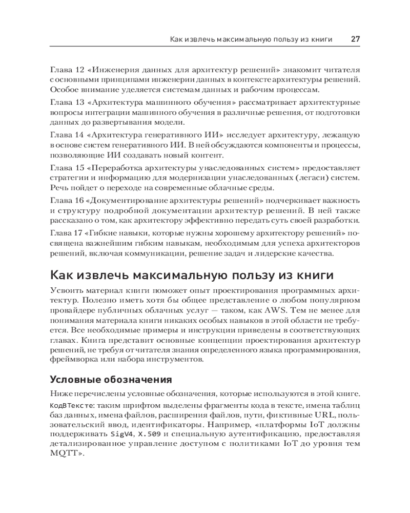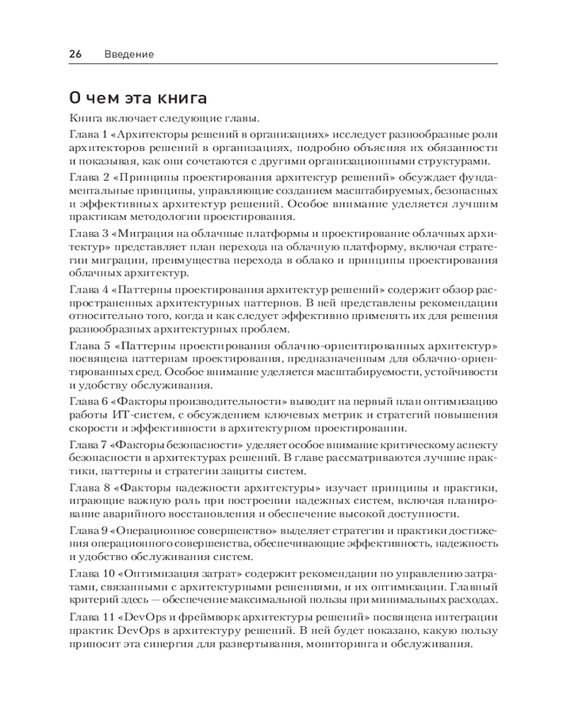Издание описывает новые интересные возможности, которые позволят вам оставаться в авангарде этой стремительно развивающейся сферы. Большие языковые модели, генеративный ИИ, инновации в области глубокого обучения — все эти революционные достижения формируют будущее технологии. Такие темы, как облачно-ориентированные архитектуры, инженерия данных, облачная оптимизация, модернизация мейнфреймов и создание экономичных и безопасных архитектур, продолжают оставаться актуальными в современной технологической сфере. В книге рассматриваются эти перспективные и ключевые технологии, а также приводится пошаговое описание процесса проектирования архитектур решений, начиная с ключевых принципов. Она снабдит вас знаниями, необходимыми, чтобы стать успешным архитектором решений, а также поможет усовершенствовать гибкие навыки и тем самым получить возможность для развития карьеры.
