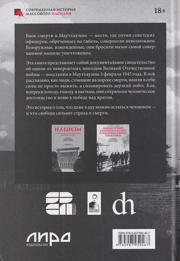 💳 Оплатить за товар можно при получении 🇰🇿 Есть бесплатная доставка по Казахстану от 1 дня 🎁 Копите бонусы с каждой покупки Серия: Современная история массового насилия «Охота на зайцев», или Мюльфиртельская охота — так называлась операция по поимке сбежавших заключённых из «блока смертников» страшного концлагеря Маутхаузен. Это документальная повесть о подвиге советских военнопленных, которые нашли в себе силы организовать восстание и вырваться на свободу из лап вооруженных до зубов эсэсовцев. Эту историю должен знать каждый. |
