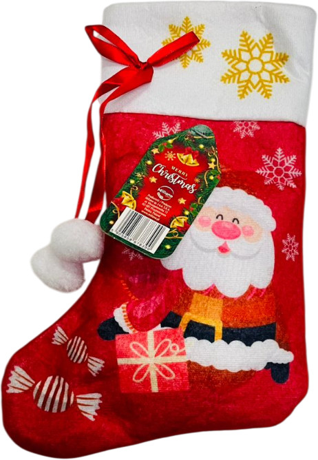 • праздничная упаковка: красный или зеленый носок украшен милыми аппликациями деда мороза (санты), оленей, снежинок и подарков, что создает особое настроение и радость как для детей, так и для взрослых;