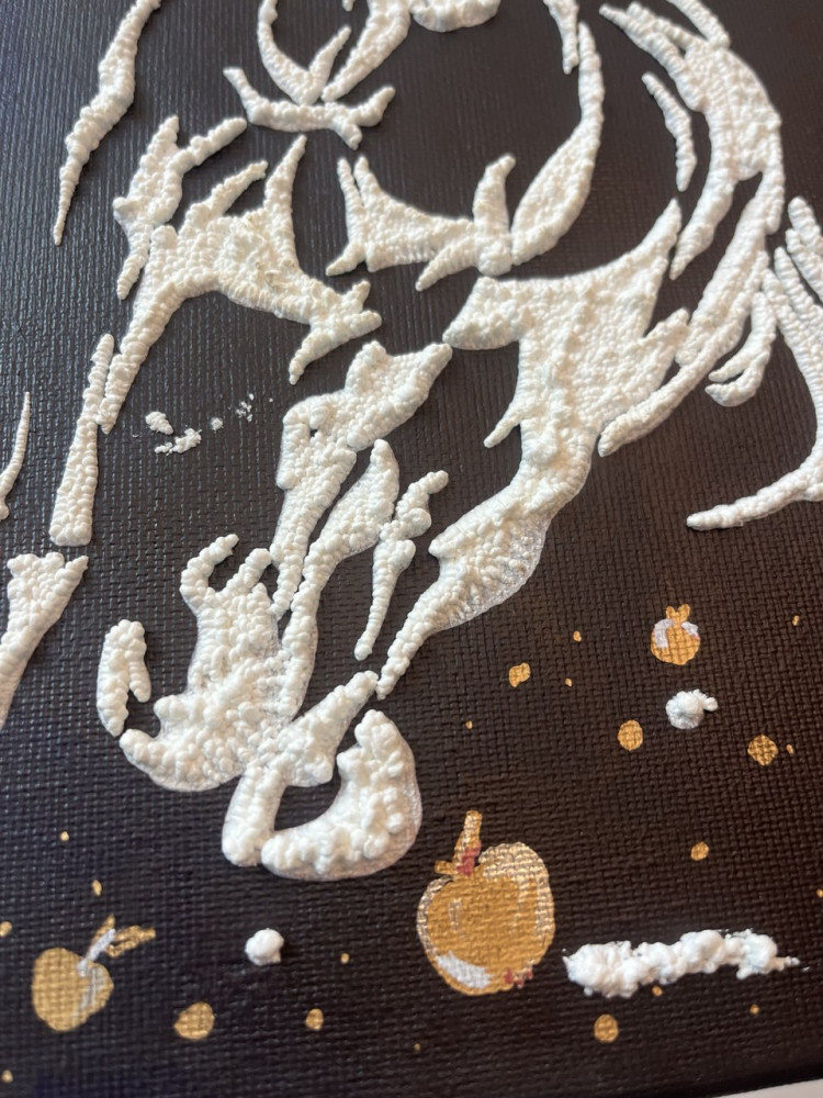Фактурная картина в стиле современного минимализма, выполненная акрилом с использованием воздушной пасты. Объёмный белый рельеф эффектно выделяется на глубоком тёмном фоне, создавая ощущение света, движения и внутреннего баланса. Работа притягивает взгляд и наполняет пространство энергией и надеждой на перемены к лучшему.