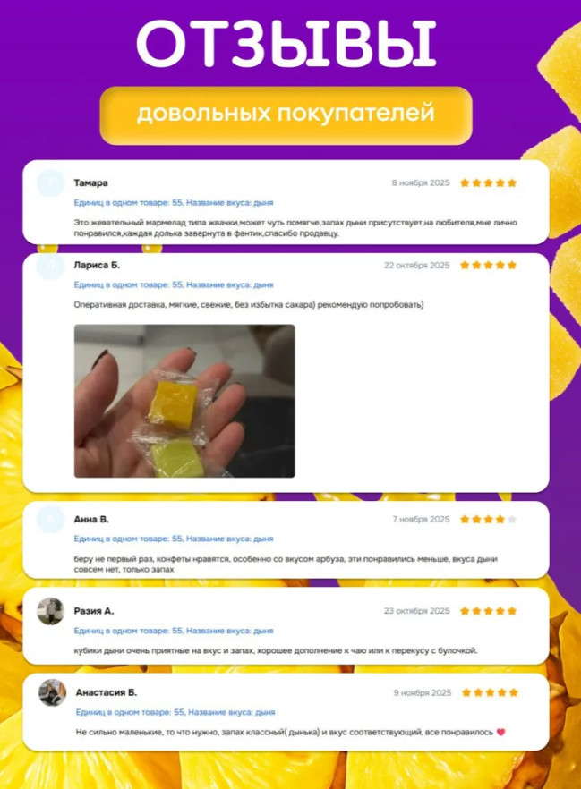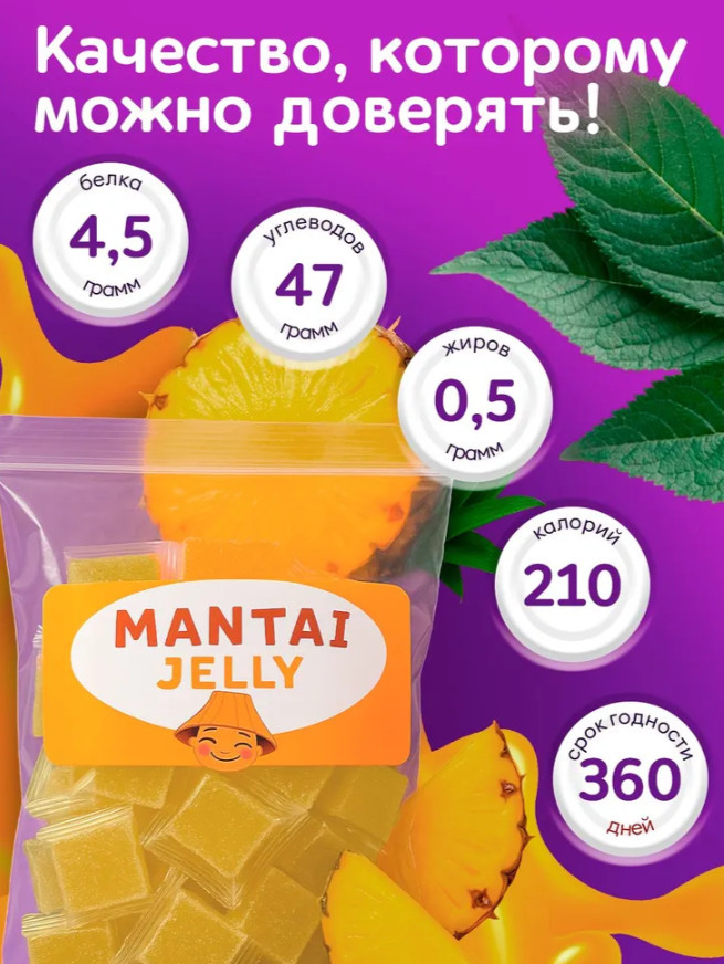 Эти желейные конфеты Mantai с восхитительным вкусом ананаса станут настоящим лакомством для всех любителей сладкого. Каждая конфета представляет собой мягкий и упругий мармелад, который тает во рту, оставляя приятное фруктовое послевкусие. В упаковке 500 грамм, что достаточно для того, чтобы поделиться вкусом с друзьями и близкими. Конфеты Mantai без начинки, что делает их идеальным вариантом для тех, кто предпочитает чистый, насыщенный вкус ананаса. Они станут отличным дополнением к чашечке чая или кофе, а также прекрасным перекусом в течение дня. Благодаря своему яркому вкусу и привлекательному внешнему виду, конфеты Mantai с ананасом станут отличным подарком для мамы, подруги или ребенка на 8 марта, день рождения или просто так. Эти желейные конфеты Mantai — это не только вкусно, но и полезно: они не содержат ГМО, а также богаты углеводами, которые дадут вам заряд энергии на весь день.