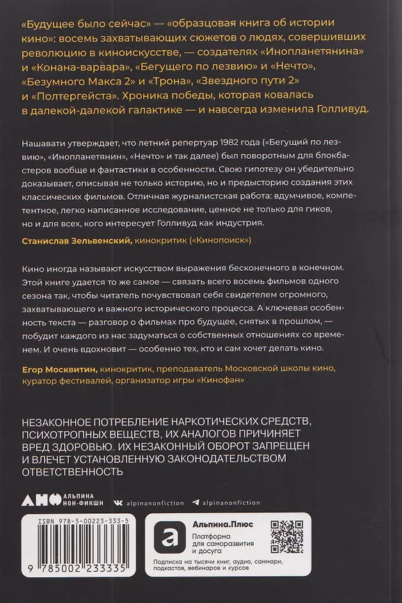 💳 Оплатить за товар можно при получении 🇰🇿 Есть бесплатная доставка по Казахстану от 1 дня 🎁 Копите бонусы с каждой покупки Крис Нашавати описывает переломный момент в истории Голливуда и мирового кино: сумасшедшее лето 1982 года, в течение которого один за другим на экран вышли восемь научно-фантастических фильмов, ставших культовой классикой: «Инопланетянин» и «Конан-варвар», «Бегущий по лезвию» и «Нечто», «Безумный Макс 2» и «Трон», «Звездный путь 2» и «Полтергейст». Некоторые оказались абсолютными блокбастерами, некоторые тогда провалились в прокате — но в итоге все они заняли важнейшее место в истории кино. «Будущее было сейчас» — «образцовая книга об истории кино»: восемь захватывающих сюжетов о создателях этих фильмов, людях, совершивших революцию в киноискусстве. Хроника победы, которая ковалась в далекой-далекой галактике — и навсегда изменила Голливуд. |