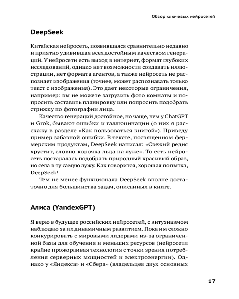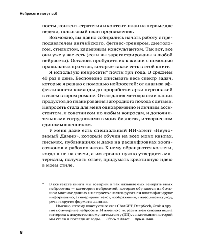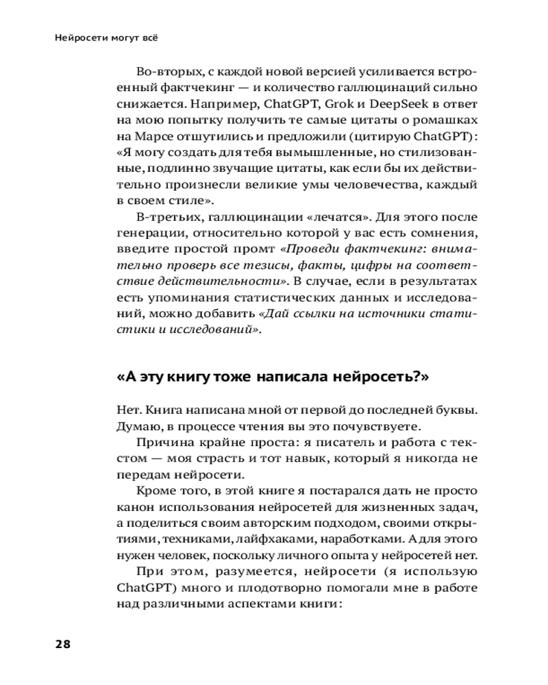💳 Оплатить за товар можно при получении 🇰🇿 Есть бесплатная доставка по Казахстану 🎁 Копите бонусы с каждой покупки Представьте, что у вас появился личный ассистент, который работает 24/7, никогда не устает и готов помочь в любой ситуации — от планирования ужина до запуска собственного блога, от изучения английского до решения карьерных вопросов. Этот помощник уже есть у каждого из нас — это нейросети. Но почему одни получают от них потрясающие результаты, а другие — лишь шаблонные ответы? Секрет в правильно составленных промтах — запросах, которые превращают искусственный интеллект в вашего идеального помощника. В этой книге собраны 254 готовых промта для всех сфер жизни: здоровье, карьера, творчество, отношения, саморазвитие и десятки других направлений. |