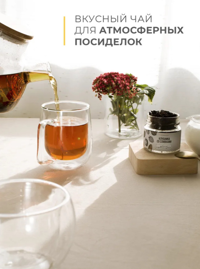• чай клубника со сливками — индийский чёрный чай, ягоды клубники, сафлор, натуральные масла;