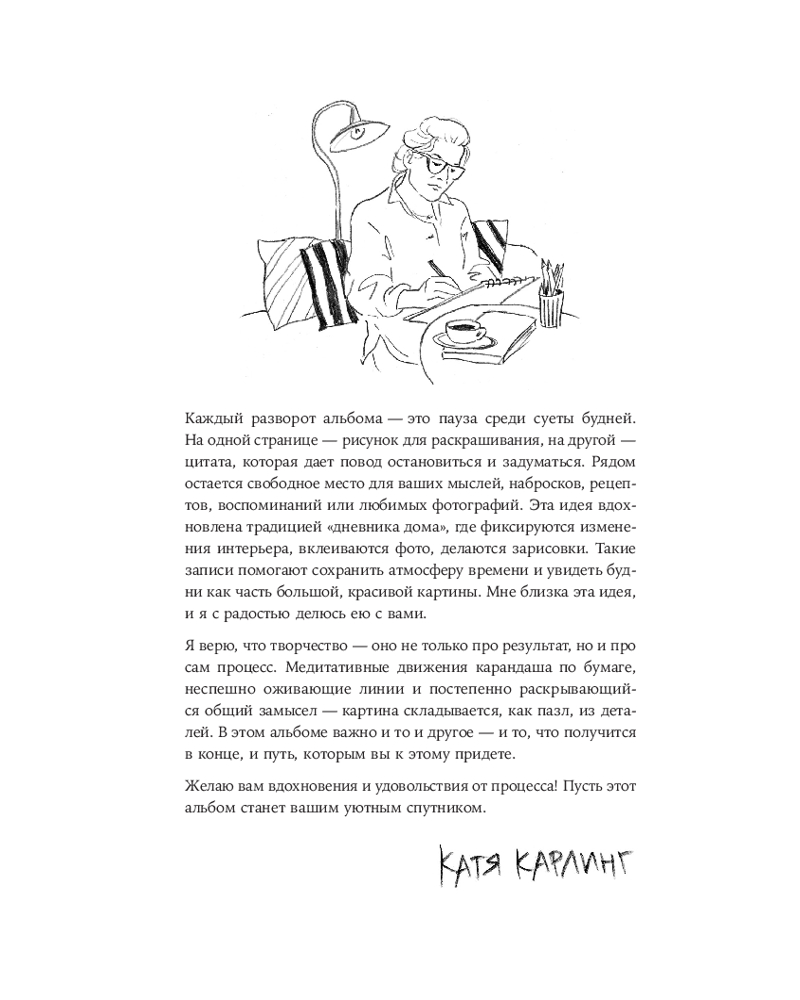 💳 Оплатить за товар можно при получении 🇰🇿 Есть бесплатная доставка по Казахстану от 1 дня 🎁 Копите бонусы с каждой покупки Возьмите в руки карандаши и окунитесь в мир уюта! Перед вами раскраска-антистресс от автора книги «Скандинавский дизайн: Как сделать дом уютным». Разместитесь в любимом кресле, укутайтесь в мягкий плед и раскрасьте минималистичные интерьеры, солнечные пейзажи на морском берегу, сценку в уличном кафе или фрагмент дачного сада. На свободном месте рядом можно записать ваши мысли, набросать скетчи или приклеить любимые фотографии. Этот альбом поможет сделать паузу и зарядиться позитивом. |