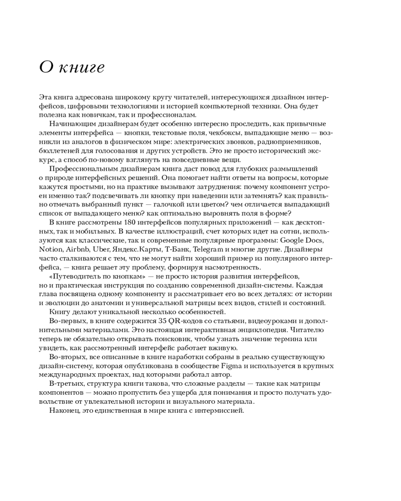💳 Оплатить за товар можно при получении 🇰🇿 Есть бесплатная доставка по Казахстану от 1 дня 🎁 Копите бонусы с каждой покупки Цельная история о логике интерфейсов: от первых Xerox Alto и Apple Lisa до macOS/Windows, от Newton до iPhone/Android и дальше — к смешанной реальности (Meta Quest, Apple Vision). На конкретных примерах и сотнях иллюстраций автор последовательно разбирает происхождение стандартных компонентов (кнопки, чекбоксы, списки, меню, поля ввода, вкладки), их анатомию и все состояния — и как на их основе собрать собственную универсальную дизайн-систему вместо бездумного копирования шаблонов. |