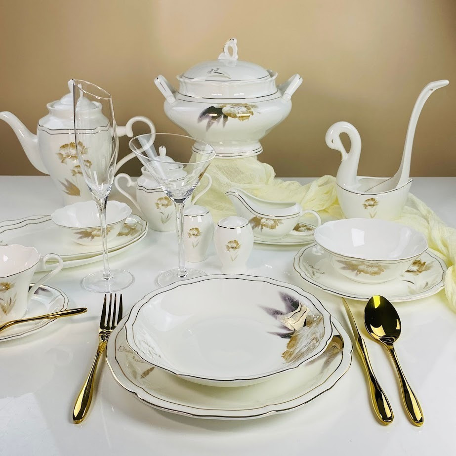 Элегантный обеденный сервиз серии «Камилла» зассчитан на 12 персон и включает 105 предметов, выполнен из высококачественного костяного фарфора. Изделия отличаются утончённым дизайном с изящным золотым декоративным покрытием, которое придаёт сервизу благородный, торжественный вид и великолепно смотрится на праздничном и повседневном столе.