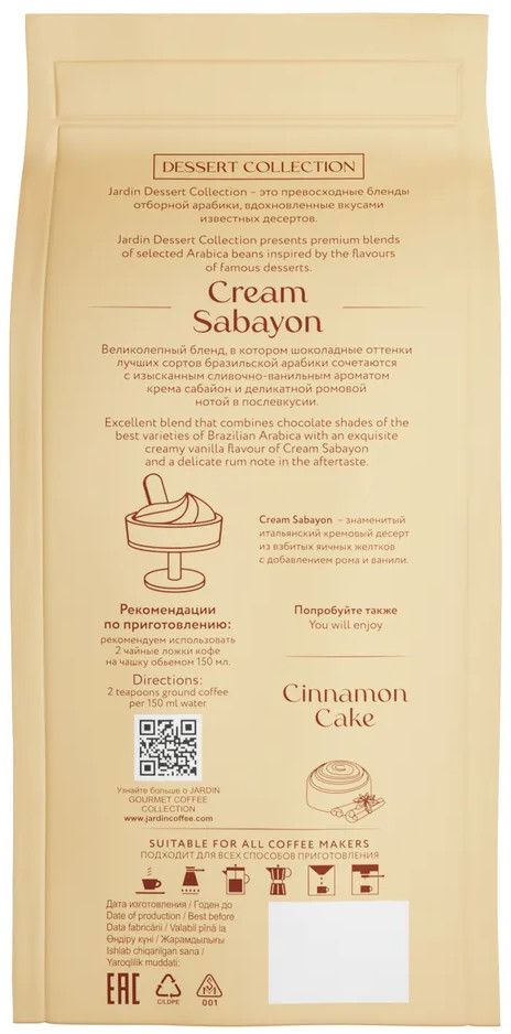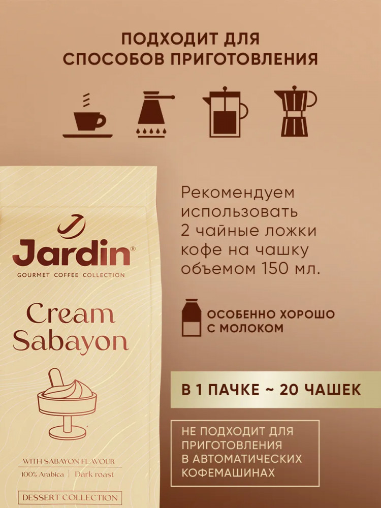 Кофе молотый Jardin Cream Sabayon 200г — великолепный бленд, в котором шоколадные оттенки лучших сортов бразильской арабики переплетаются со сливочно-ванильными нотками крема сабайон. Этот кофе покорит вас своим неповторимым вкусом с деликатной ромовой ноткой послевкусии, а в его аромате вы отчетливо ощутите оттенки итальянского кремового десерта из взбитых яичных желтков. Готовьте напиток в турке, капельной кофеварке, чашке или во френч-прессе — благодаря оптимальному помолу и бережной обжарке он получается поистине изумительным при любом способе заваривания. Прочная герметичная упаковка исключает контакт кофе с кислородом, позволяя сохранить все нюансы его многогранного вкуса.