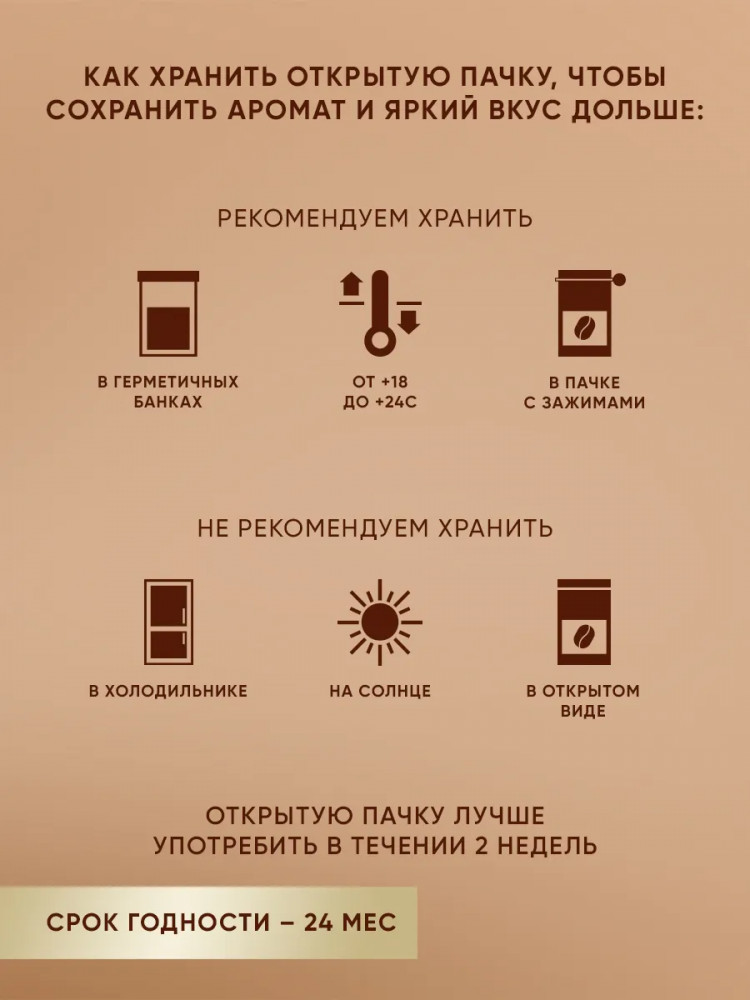 Способ приготовления: рекомендуем использовать 2-3 ложки молотого кофе на чашку объемом 150мл