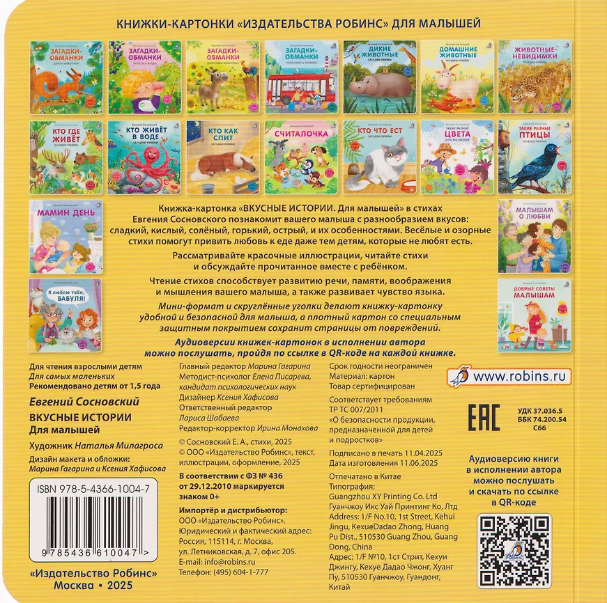 Вкусные истории для малышейЕвгений Анатольевич Сосновский В данный момент этот товар отсутствует в продаже. Возможно, у нас найдется аналогичный или похожий товар здесь. Серия: Книжки-картонки Книжка-картонка «Вкусные истории» Евгения Сосновского познакомит вашего малыша с разнообразием вкусов: сладкий, кислый, солёный, горький, острый, и их особенностями. Весёлые и озорные стихи помогут привить любовь к еде даже тем детям, которые не любят есть. Рассматривайте красочные иллюстрации, читайте стихи и обсуждайте прочитанное вместе с ребёнком. |
