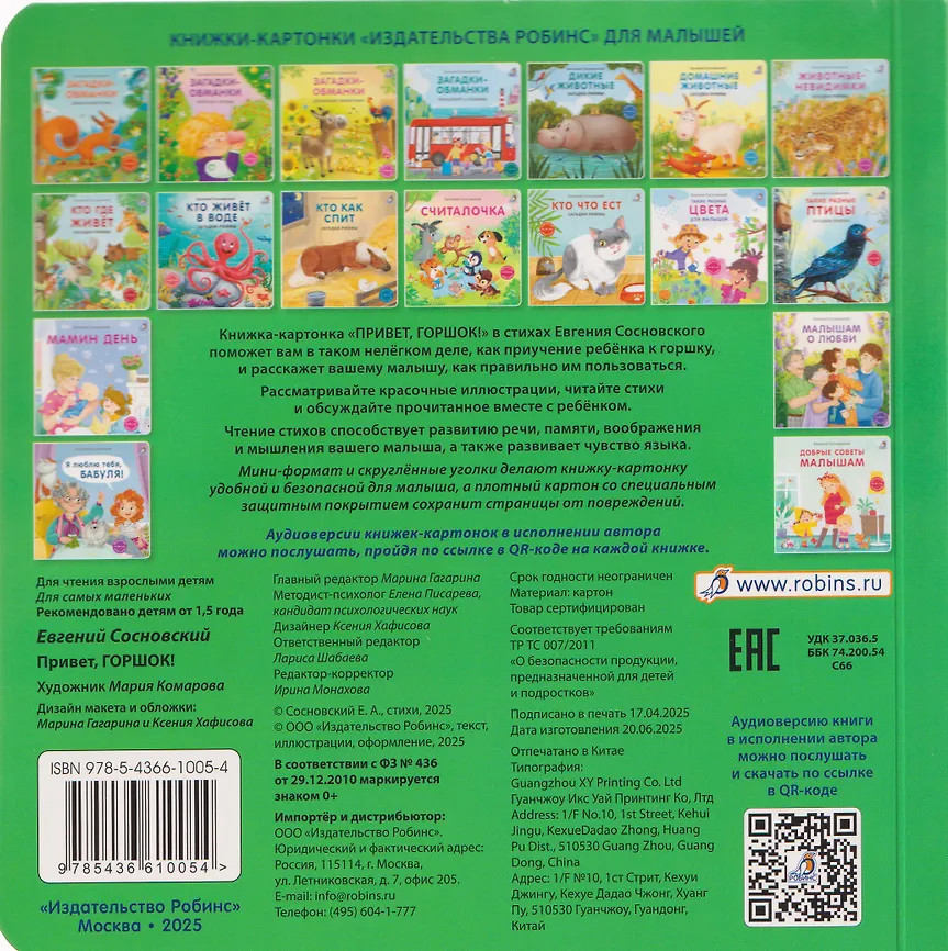 💳 Оплатить за товар можно при получении 🇰🇿 Есть бесплатная доставка по Казахстану от 1 дня 🎁 Копите бонусы с каждой покупки Серия: Книжки-картонки Книжка-картонка «Привет, горшок!» в стихах Евгения Сосновского поможет вам в таком нелёгком деле, как приучение ребёнка к горшку, и расскажет вашему малышу, как правильно им пользоваться. Рассматривайте красочные иллюстрации, читайте стихи и обсуждайте прочитанное вместе с ребёнком. |