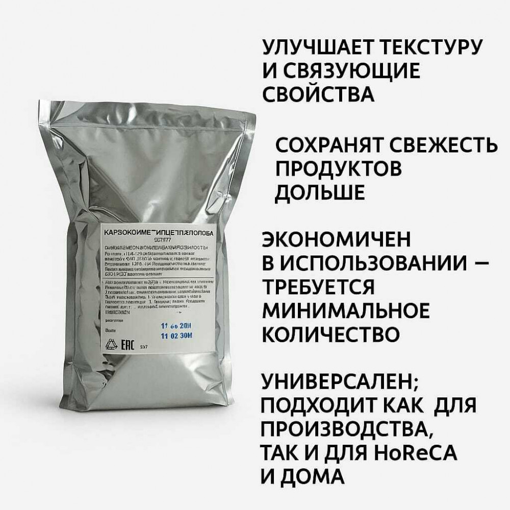 Карбоксиметилцеллюлоза КМЦ Е466В данный момент этот товар отсутствует в продаже. Возможно, у нас найдется аналогичный или похожий товар здесь. Карбоксиметилцеллюлоза (КМЦ) — это водорастворимое производное целлюлозы, используемое в качестве загустителя, стабилизатора, эмульгатора и пленкообразователя в широком спектре отраслей, включая пищевую (как добавка Е466), косметическую (кремы, шампуни), фармацевтическую (расщепление таблеток) и строительную (сухие смеси, клеи). КМЦ улучшает текстуру, предотвращает разделение ингредиентов, удерживает влагу и стабилизирует суспензии, а также обладает уникальной способностью образовывать гели. |