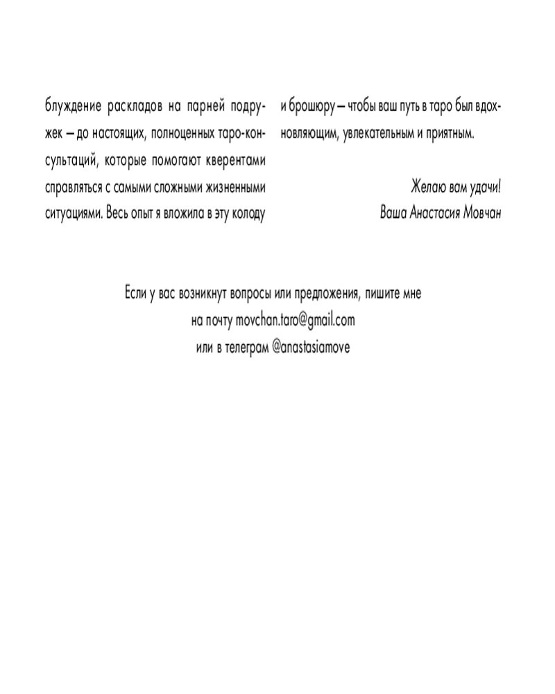 💳 Оплатить за товар можно при получении 🇰🇿 Есть бесплатная доставка по Казахстану от 1 дня 🎁 Копите бонусы с каждой покупки Серия: Карты Таро (Подарочная коробка с картами и книгой) Погрузитесь в обучение Таро. Перед вами курс по Таро от практикующего мастера Анастасии Мовчан. Живое обучение — практикуйте и трактуйте! В комплекте: колода из 78 классических карт Таро (знаменитая колода Уэйта) с трактовками основных символов, прямым и перевернутым значениями, с двумя дополнительными значениями на любовь и на деньги. А также учебная книга — рабочая тетрадь с самой нужной информацией по Таро, пошаговой инструкцией по работе с картами и секретами мастерства. Обучайтесь Таро на практике и творите свою реальность! |