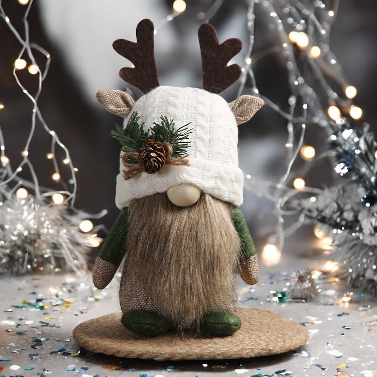 Новогодний скандинавский гном с оленьими рожками (23 см) — волшебство в каждой детали. Пригласите новогоднюю сказку в свой дом с этим очаровательным лесным гостем! Наш скандинавский гном в уютном зеленом вязаном колпаке — это не просто украшение, а настоящий хранитель праздничной атмосферы.