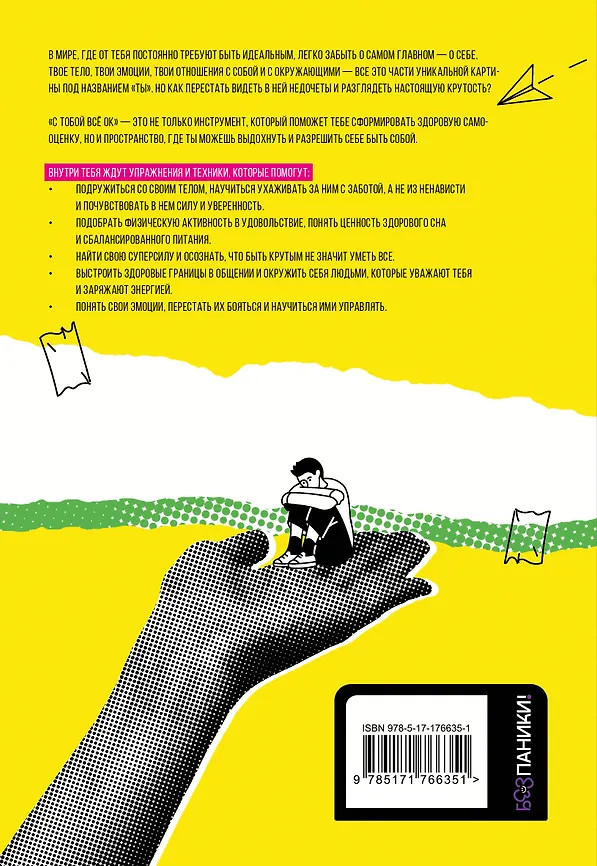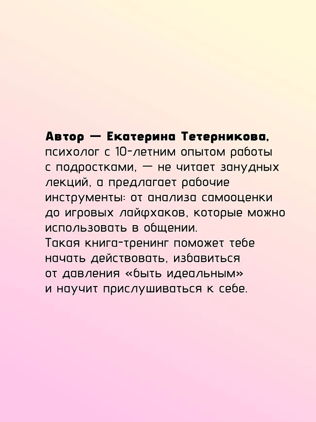 💳 Оплатить за товар можно при получении 🇰🇿 Есть бесплатная доставка по Казахстану от 1 дня 🎁 Копите бонусы с каждой покупки Серия: Без паники! Практикум на все случаи жизни Екатерина Тетерникова — клинический психолог, диалектико-поведенческий терапевт, специалист по работе с нарушениями пищевого поведения, преподаватель Московского Института Психоанализа, супервизор. Более десяти лет работает с подростками и взрослыми, страдающими РПП, помогает им изменить отношение к собственному телу, преодолеть кризисные ситуации и повысить стрессоустойчивость. В мире, где от тебя постоянно требуют быть идеальным, легко забыть о самом главном — о себе. Твое тело, твои эмоции, твои отношения с собой и с окружающими — все это части уникальной картины под названием «ТЫ». Но как перестать видеть в ней недочеты и разглядеть настоящую крутость? «С тобой всё ОК» — это не только инструмент, который поможет тебе сформировать здоровую самооценку, но и пространство, где ты можешь выдохнуть и разрешить себе быть собой. |